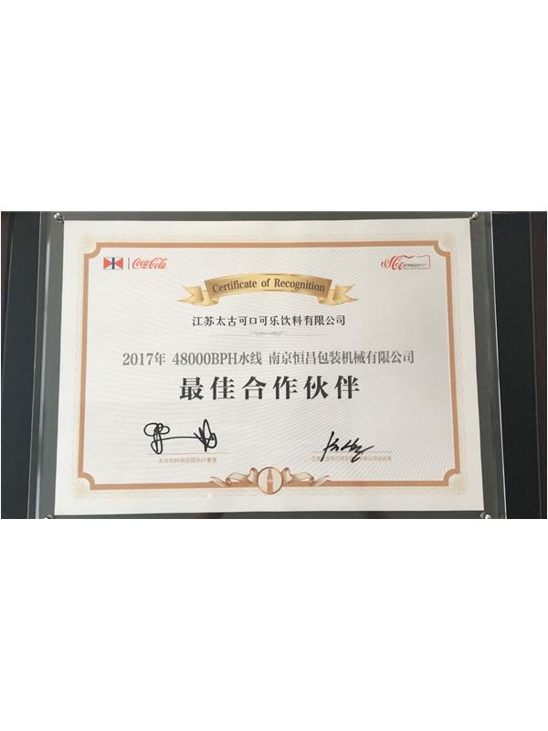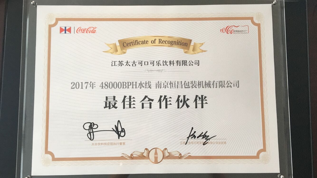 南京恒昌包裝作為后段整包商,在江蘇太古可口可樂(lè)48000bph水線(xiàn)項(xiàng)目中獲得“最佳合作伙伴”殊榮!